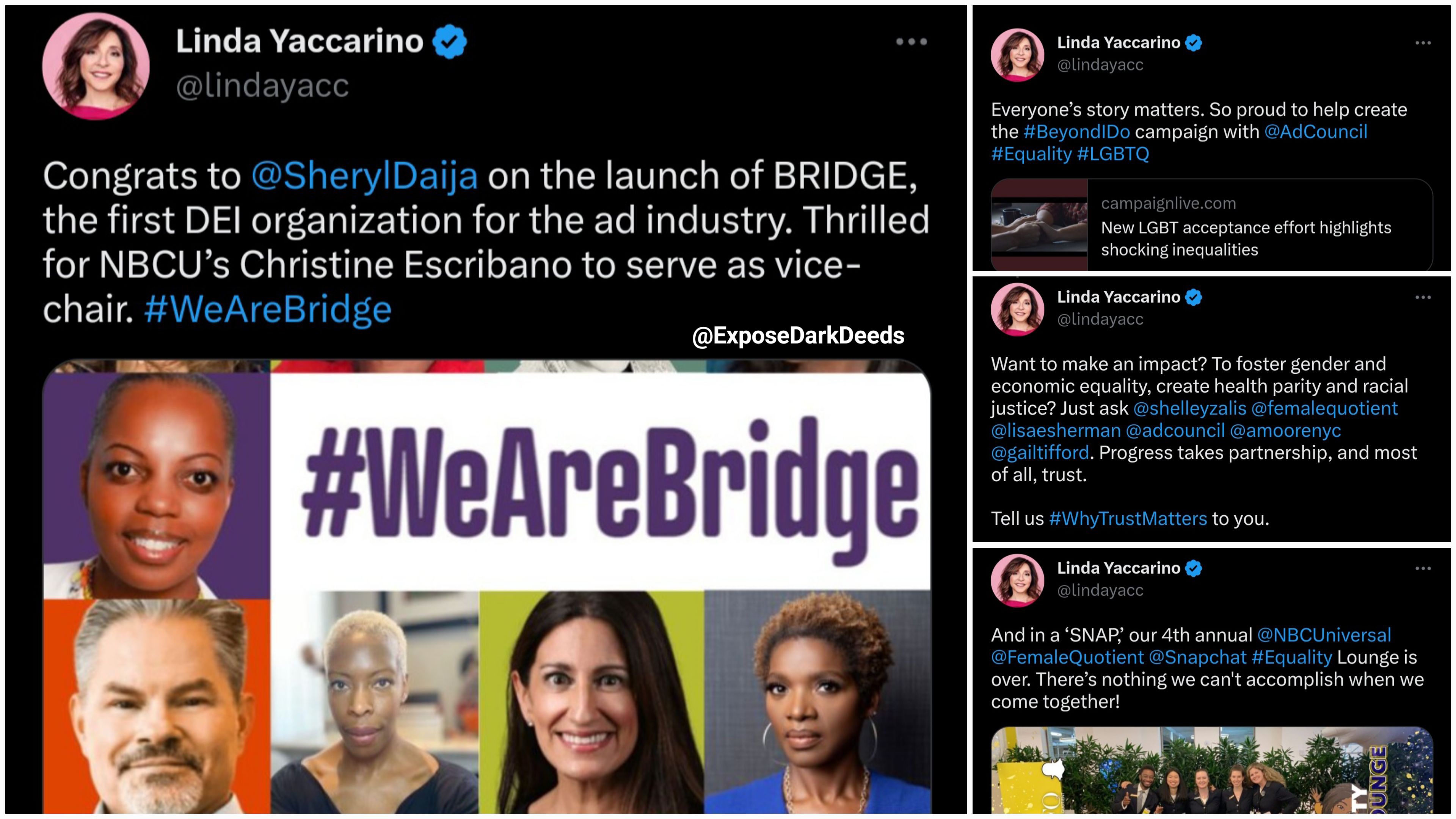 In Ad Council, un’organizzazione americana che produce e promuove annunci di servizio pubblico, Yaccarino ha fatto il suo ingresso nel 2014 e dal 2021 è presidente del consiglio d’amministrazione. Durante la finta pandemia l’associazione ha stretto un accordo con la casa bianca per produrre numerosi video al fine di propagandare il distanziamento sociale e l’utilizzo delle mascherine, e in seguito campagne pubblicitarie per promuovere i vaccini Covid che hanno coinvolto numerosi influencer famosi e persino papa Bergoglio. Yaccarino ha manifestato il suo fondamentalismo sanitario scrivendo su Twitter di restare a casa, usare le mascherine e di vaccinarsi (1, 2, 3). Non sono mancati inoltre tweet dove chiedeva l’accelerazione della "giustizia razziale" e in cui si è vantata di aver prodotto con Ad Council pubblicità a sostegno della comunità LGBT.